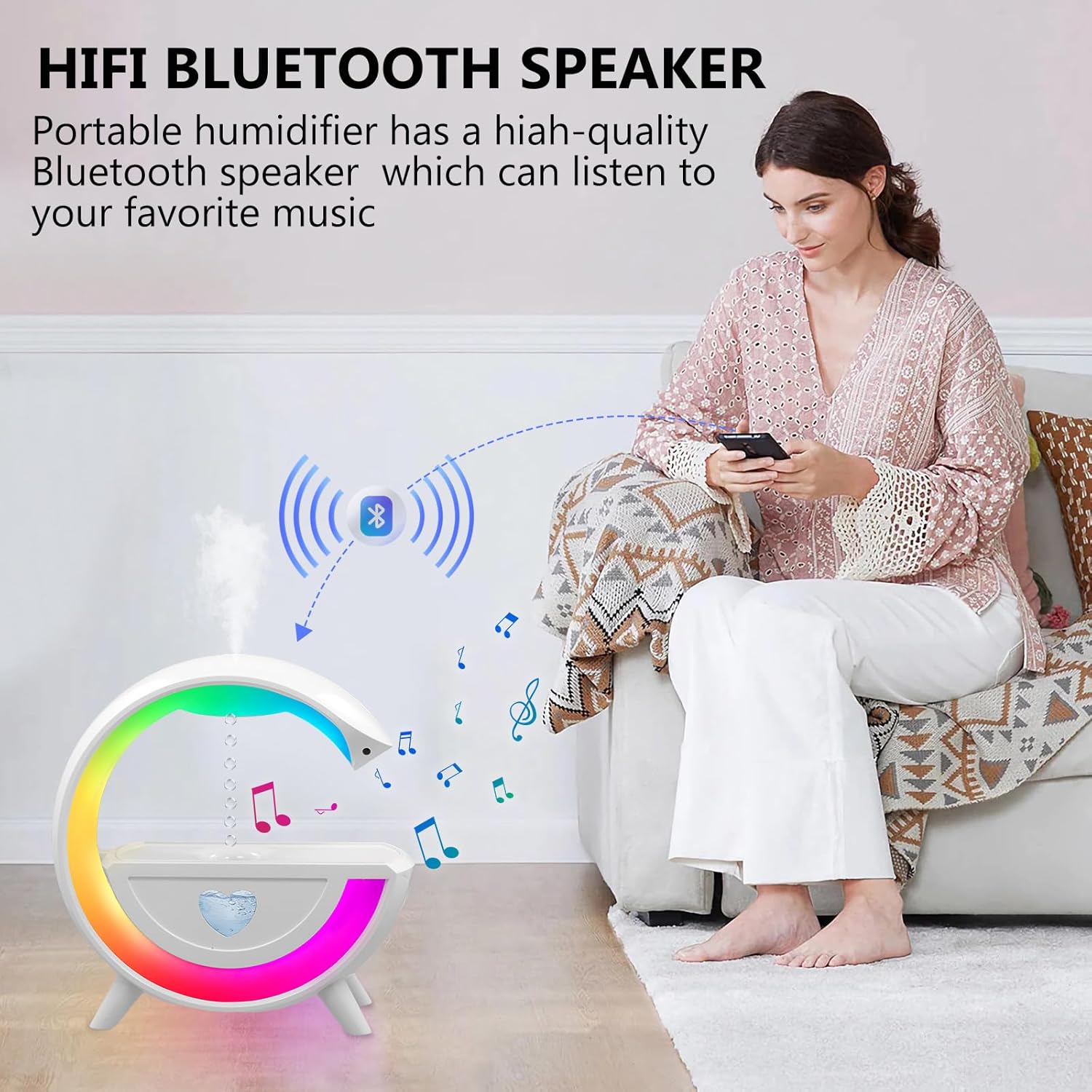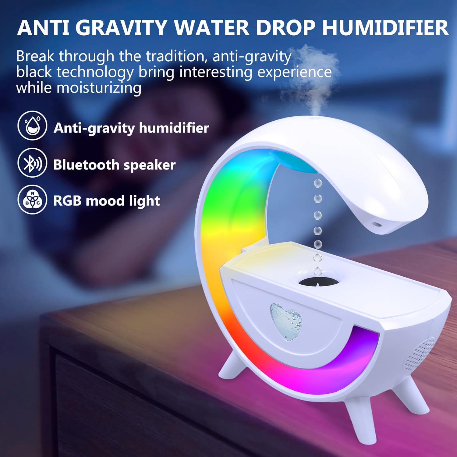 📌 ৪-in-১ গ্যাজেট – RGB Light + Humidifier + Water Effect + Bluetooth Speaker