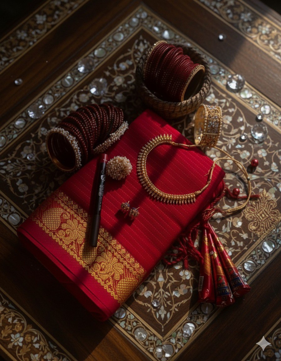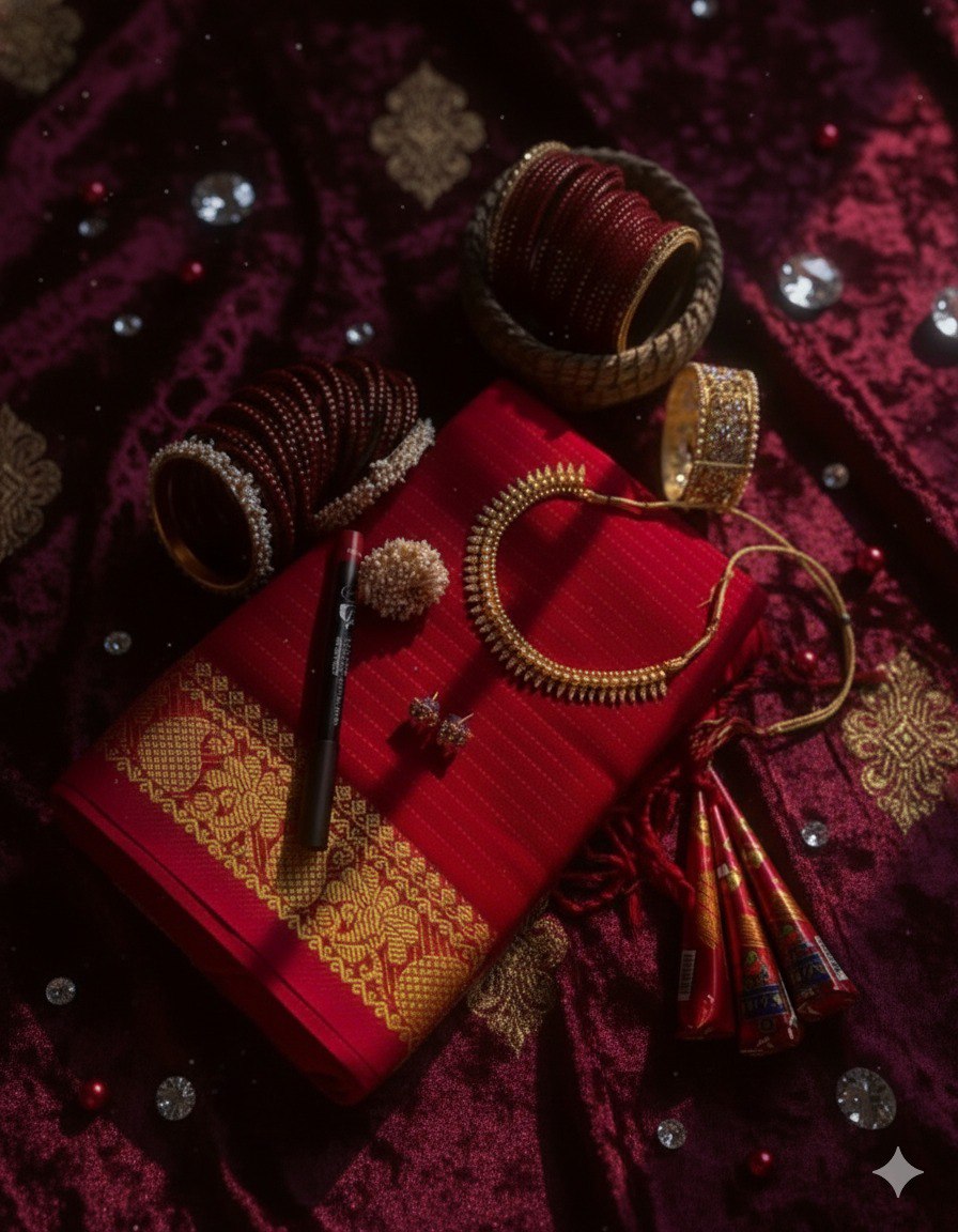 চুড়ি (Bangles) – গাঢ় লাল কাঁচের চুড়ি, মাঝে সোনালি ও মুক্তার অলংকরণসহ।
