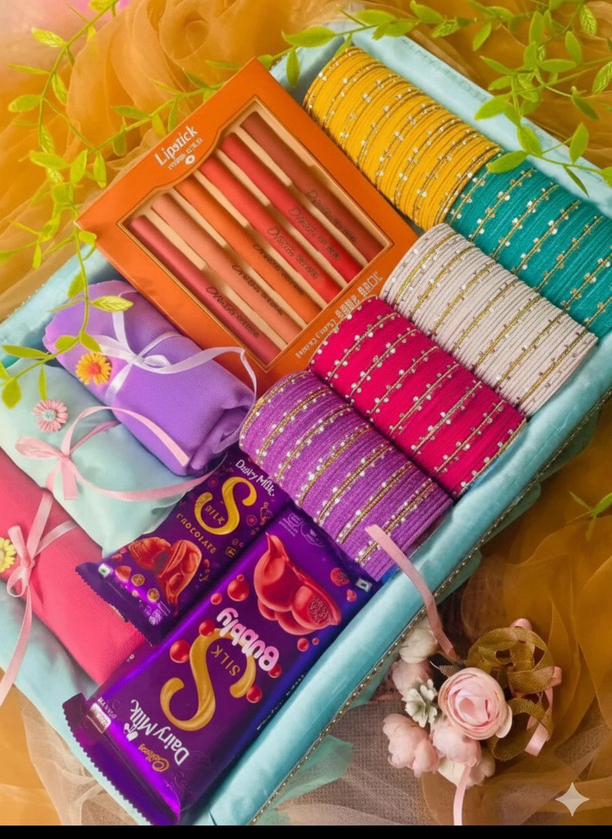 চুড়ি (Churi) Stacks of brightly colored bangles, wrapped in thread/fabric, in yellow, teal, white/cream, magenta, and purple.